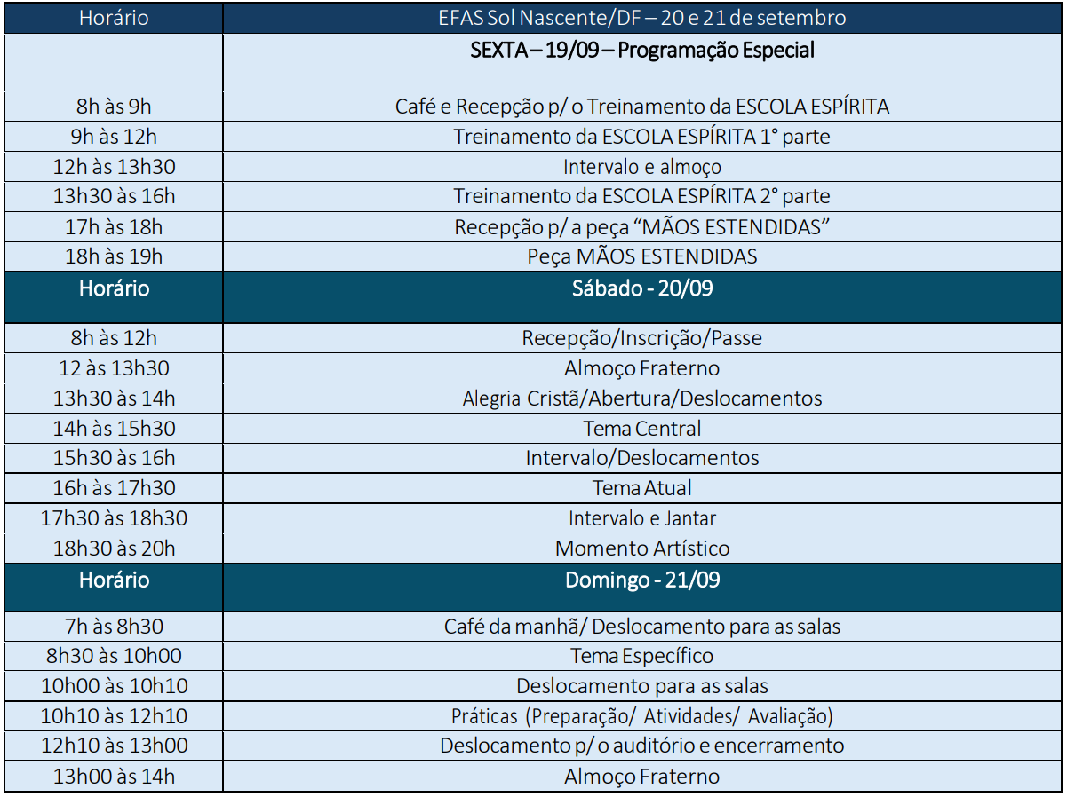Página Inicial 5762° Encontro Fraterno Auta de Souza/DF 20 e 21 de setembro de 2025 TEMA CENTRAL“Eu vim para que tenham vida e a tenham em abundância” João 10:10 TEMA ESPECIAL“Entre a dor e a esperança: Caminhos para não desistir.” LocalUNB – Câmpus Ceilândia (Adultos) AlojamentoCentro Espírita O Consolador CozinhaSODEAS. Veja agora nossa programação! 20 e 21de setembro Cursos (Atuais e Específicos) Jovens (12 e 13 anos) Evangelização Infantil Inscrições - Clique aqui